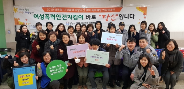성남시에서는 이의 일환으로 여성폭력예방 연합캠페인을 개최하며, 금번 캠페인은 관내경찰서를 비롯해 가정폭력‧성폭력‧성매매피해자상담소, 경기해바라기센터(아동), 성남시 여성단체협의회등 여성관련 복지기관‧단체 관계자 시민 등 100여 명이 참여해, 폭력을 예방하고 대처할 수 있는 내용이 담긴 리플릿과 기념 홍보물 배부 및 사진전시회 등 시민들이 쉽게 참여할 수 있는 프로그램으로 운영되었다.