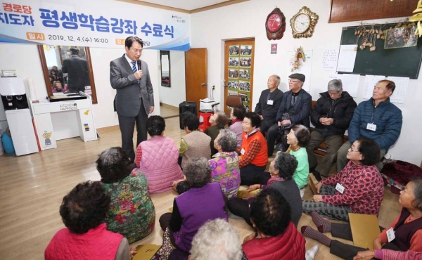 백군기 용인시장은 4일 처인구 백암면 장평경로당에서 9월부터 3개월간 운동 ‧ 도자기 ‧ 미술 등 평생학습 강좌를 수료한 52명의 어르신에게 수료증을 전달했다.이날 장평경로당 어르신을 포함한 관내 21곳 경로당 350명의 어르신들이 수료증을 받았다.