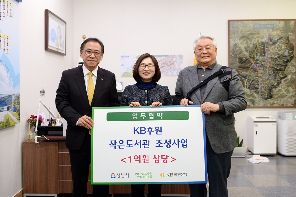 성남시는 12월 13일 오후 2시 시장 집무실에서 은수미 성남시장과 양재영 KB국민은행 경기남지역 영업그룹 대표, 김수연 ㈔작은도서관 만드는 사람들 대표 등이 참석한 가운데 ‘중원청소년수련관 작은도서관 리모델링에 관한 업무 협약’을 했다.