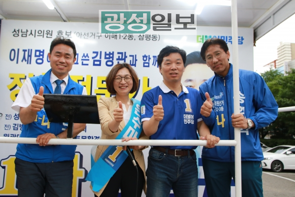 9일 오후, 은수미 성남시장 후보는 김병관 국회의원과 함께 분당(갑) 1-나 후보 3명의 지역을 차례로 돌며 각 후보 캠프 앞 지원 연설뿐만 아니라, 유세차에 동승해 지역 곳곳을 누비면서 시민들에게 세 후보들에 대한 지지를 적극 호소했다.