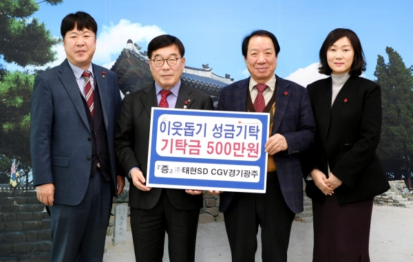 NH농협은행 광주시지부 김현용 지부장 일행은 24일 광주시를 방문해 어려운 이웃에게 전달해 달라며 성금 1천만원을 전달했다.또한, 이날 ㈜태현SD CGV경기광주 김응태 대표이사는 성금 500만원을, 참조은병원 원종화·안준환 공동원장 일행도 성금 300만원을 기탁했다.