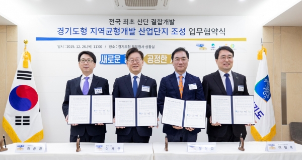 경기도가 ‘전국 최초’로 개발수요가 풍부한 산단에서 발생하는 이익을 경기북부 등 열악한 산단에 투자하는 ‘산단 결합개발 방식’을 본격 추진한다.이재명 경기도지사와 정장선 평택시장, 최종환 파주시장, 이헌욱 경기도시공사 사장은 26일 오전 경기도청 상황실에서 이 같은 내용의 ‘경기도형 지역균형개발 산단’ 조성 업무협약을 체결했다.