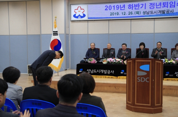 성남도시개발공사(사장 윤정수, 이하 공사)는 26일 11시 성남탄천종합운동장 체육회관 1층 이벤트 홀에서‘2019년 하반기 정년퇴임식’을 가졌다.