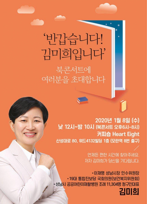 김미희 예비후보는 2020년 1월 8일 오후 6시, 모란역 근처 카페 ‘하트 에이트’에서 북콘서트를 통해 대화를 나눈다. 낮 12시부터 밤 10시까지 편한 시간에 오면 저자 김미희 예비후보를 만날 수 있다.