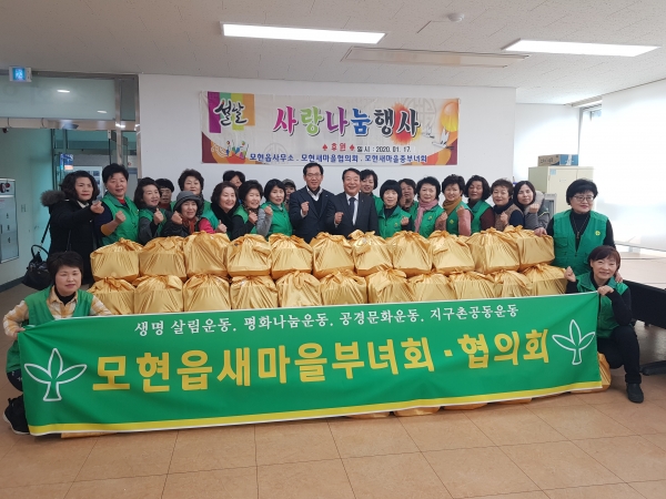 이날 처인구 모현읍에서는 새마을 지도자협의회와 부녀회가 관내 홀로어르신과 저소득 가정 115가구에 쌀 10kg ‧ 떡 2kg ‧ 김이 든 선물세트를 전달했다.이 성품은 관내에서 모은 헌옷과 김 등을 수시로 주민들에게 판매한 수익금으로 마련한 것이다.