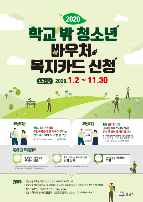성남시(시장 은수미)는 올해 1억8000만원을 투입해 ‘학교 밖 청소년 바우처 복지 카드 지원사업’을 편다. 공교육의 혜택을 받지 못하는 학교 밖 청소년의 자기계발을 지원하기 위해 분기별 15만원씩(월 5만원)을 모바일 성남사랑상품권 충전방식으로 지급한다.