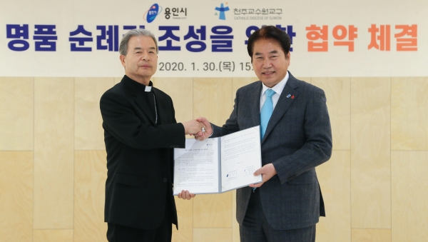 용인시(시장 백군기)는 30일 천주교 수원교구청 대강당에서 천주교 수원교구(교구장 이용훈 주교)와 ‘명품 순례길’ 조성을 위한 업무협약을 체결했다.양 기관이 협력해 천주교 관련 역사적 명소인 은이성지와 손골·한덕골 성지, 고초골 공소, 이윤일 요한 묘역 일대에 조성하는 명품 순례길의 역사적 의미를 널리 알리고 세계적인 명소로 만들기 위해서다.