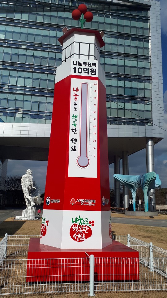 성남시(시장 은수미)는 시청 잔디광장에 설치한 ‘사랑의 온도탑’이 1월 29일 자로 100도를 달성했다고 31일 밝혔다.경기사회복지공동모금회의 지원을 받아 지난해 12월 4일 설치해 운영한 지 56일 만에 모금 목표액 달성이다.