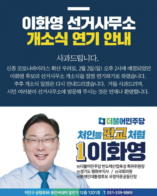 더불어민주당 이화영 용인시갑 예비후보는 당초 2일 오후 2시로 예정되었던 선거사무소 개소식을 연기한다고 밝혔다.신종 코로나바이러스 감염증에 대한 시민들의 우려가 많은 상황에서 정부의 강력하고 발 빠른 방역대책에 동참하기 위한 결정이다.