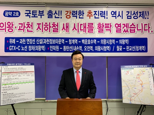 김성제 의왕과천 국회의원 예비후보가 3일, 의왕시청 브리핑룸에서 기자회견을 열고 ‘위례-과천선’을 의왕역까지 연장하고, GTX(수도권광역급행철도)-C 노선과 연계해 의왕역을 유치하는 내용이 담긴 ‘의왕·과천 광역철도망 구축공약’을 발표했다.