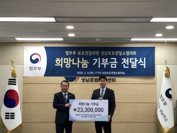 법무부 성남보호관찰소(소장 정성수)는 2월 6일 성남시청 4층 성남보호관찰소 회의실에서 민간자원봉사 단체인 법무부 보호관찰위원 성남보호관찰소협의회(회장 정동민) 후원으로 소외된 보호관찰청소년 지원을 위한 ‘희망나눔 기부금’ 전달식을 개최하였다.