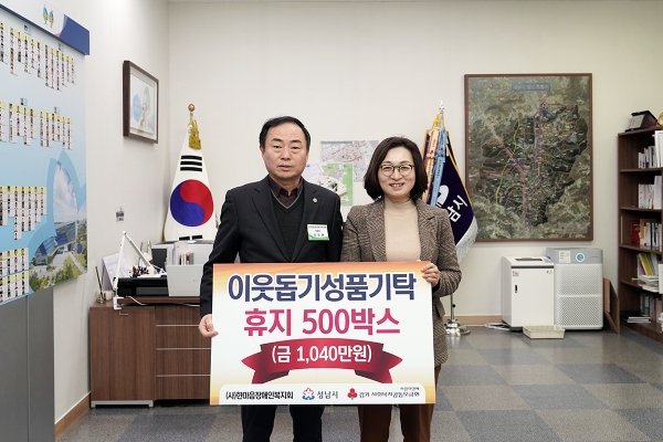 ㈔한마음장애인복지회가 어려운 이웃에게 전달해 달라며 2월 14일 성남시에 1040만원 상당의 휴지 500상자를 기탁했다.시는 이날 오후 2시 시장 집무실에서 은수미 성남시장과 조우현 ㈔한마음장애인복지회 부회장 등이 참석한 가운데 ‘이웃돕기 후원 물품 전달식을 했다.받은 물품은 두루마리 휴지 50상자(5000개), 점보롤 휴지 340상자(5440개), 핸드타올 휴지 90상자(4500개) 등이다.