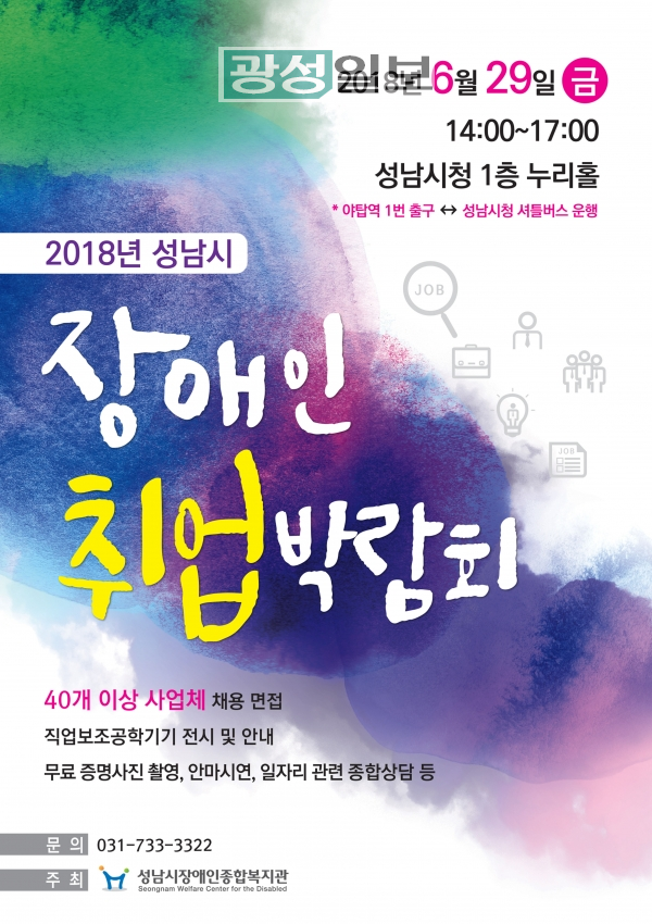 ‘2018년 성남시 장애인 취업박람회’가 오는 6월 29일 오후 2시~5시 성남시청 로비에서 열린다.현대백화점 판교점, 아프리카TV, 조이푸드, 엘에프푸드 등 40곳 기업이 구인 업체로 참여한다.150여 명의 장애인을 채용할 예정이다.채용 분야는 사무직, 생산직, 제과·제빵, 경비, 미화, 주방보조, 고객상담, 주차 안내 등 다양하다.