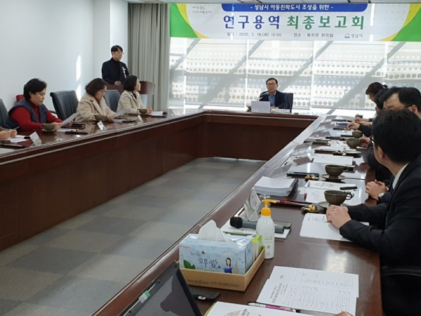 시는 2월 18일 오후 3시 시청 5층 회의실에서 ‘성남시 아동친화도시 조성을 위한 연구용역 최종 보고회’를 개최했다. 보고회에는 시 아동보육과장, 연구 용역을 맡은 ㈜모티브앤(학술용역 전문기업) 대표, 아동 관련 전문가 등 16명이 참석해 앞으로 연구수행 결과를 확인하였다.