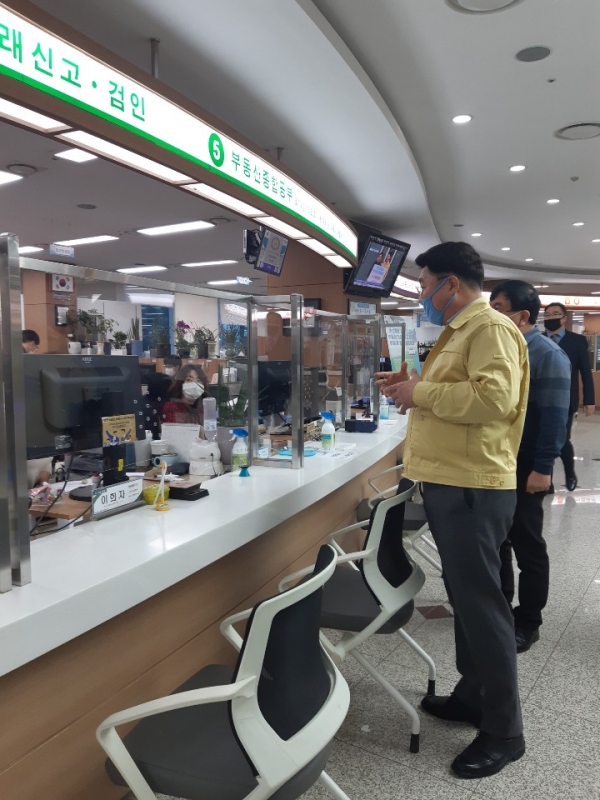 민원실 입장과 동시에 손소독을 실시하고 마스크 미소지자에 한하여 마스크를 배부하여 착용하도록 하였으며, 민원처리 및 민원상담 시 민원인 뿐 아니라 민원실 전 직원의 마스크 착용을 의무화했으며 1일 3회 종합민원실 전체의 분무 소독을 실시하고 있다.
