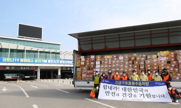 센터는 이날 5톤 트럭에 물품을 실어 대구로 보냈다. 이 물품은 대구 자원봉사센터를 통해 대구지역 의료진과 자가격리자들을 지원하는데 쓰인다.