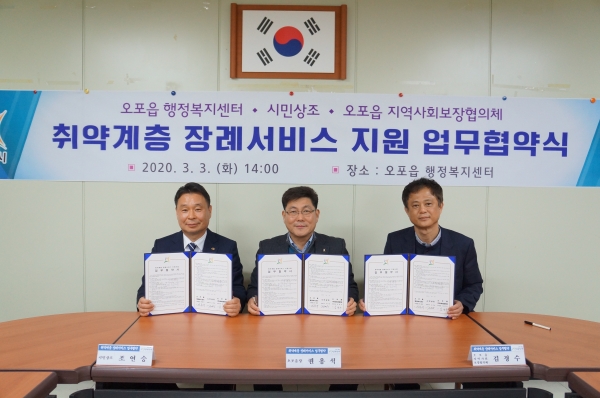 광주시 오포읍 행정복지센터(읍장 권용석)는 3일 시민상조(공동대표 조연승·이강섭), 오포읍 지역사회보장협의체(위원장 김경수)와 함께 취약계층 장례서비스 지원을 위한 업무협약을 체결했다.