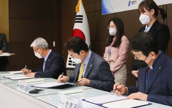 백군기 용인시장은 이날 시장실에서 안영근 하나은행 중앙1영업그룹담당 총괄 부행장, 이민우 경기신용보증재단 이사장과 ‘용인시 소상공인 육성지원을 위한 매칭출연 업무 협약’을 맺었다.감염병 여파로 골목상권이 침체되면서 소상공인들이 휴점까지 생각할 정도로 타격을 입고 있어 긴급 지원하는 것이다.