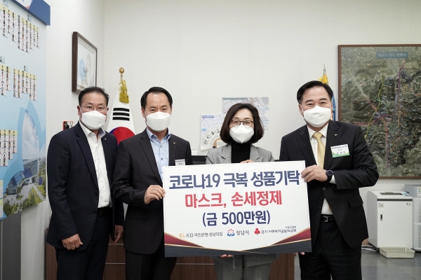 KB국민은행 성남지점이 3월 6일 코로나19 예방 물품인 마스크 1200개와 손세정제 396개(500만원 상당)를 성남시에 기탁했다.성남시는 이날 오후 2시 시장 집무실에서 은수미 성남시장과 문경호 KB국민은행 경기남지역영업그룹 대표, 김병욱 경기남1(성남)지역본부장 등이 참석한 가운데 ‘코로나19 극복을 위한 이웃돕기 후원 물품 전달식’을 했다.
