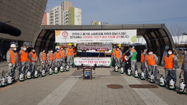 항공에서는 드론 방역을, 지상에서는 16개 기관 민관군 합동 방역단이 성남시 전역을 사각지대 없이 보다 촘촘히 방역하기 위해 지난 3월 2일부터 사태 종료 시까지 방역에 매진할 계획이다.3월 3일 모란민속5일장터를 시작으로 5일 화랑공원을 포함한 공원 4개소와 6일에는 자가격리시설로 지정된 KOICA(한국국제협력단)시설에 드론 방역을 실시했다.