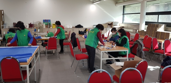 성남시 새마을부녀회와 자원봉사단체는 코로나 19의 전국적 확산에 따른 마스크 품귀현상으로 마스크 수급에 힘들어하는 이 시기에 성남시 새마을부녀회와 성남시 자원봉사자 및 봉사단체 70여명이 손을 걷어 부치고 직접 면 마스크 제작에 나섰다.