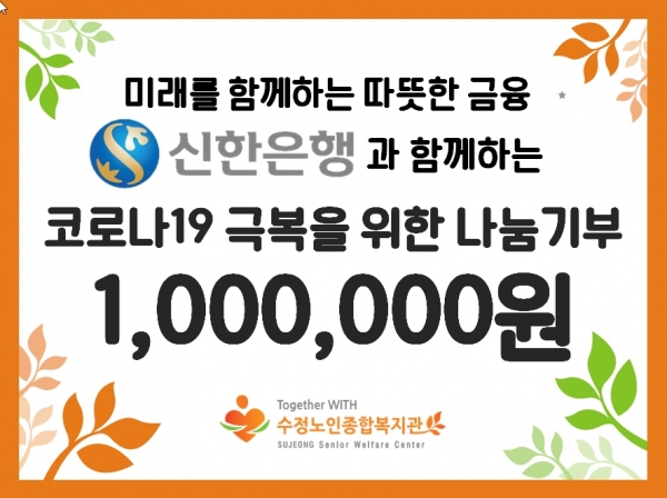 수정노인종합복지관은 지난 16일, ㈜신한은행 수원역지점으로부터 1,000,000원을 기부 받았다고 밝혔다.