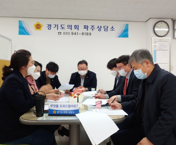경기도의회 파주상담소에서 지난 13일 파주지역 도의원 5명(조성환, 손희정,김경일, 이진, 오지혜)이 파주시청 공무원과 함께 파주시 주요현안 및 조정교부금 확보 방안을 위한 간담회를 가졌다.