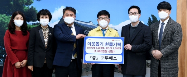 이와 함께 삼동에 위치한 손소독제, 화장품 등을 제조 및 유통하는 ㈜투에스는 품귀현상으로 구하기 어려운 손소독제(70㎖, 500㎖) 2천개와 마스크 1천개를 전달, 코로나19 위기를 함께 극복하고 싶다는 뜻을 전했다.