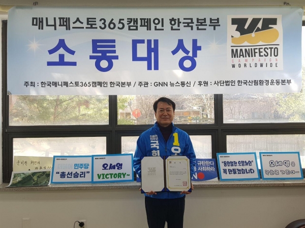 오세영 더불어민주당 용인갑 국회의원 후보가 16일 '매니페스토 365 캠페인 한국본부'(이하 매니페스토 한국본부)가 주최하는 ‘소통대상’ 경진대회에서 최우수상을 수상했다.