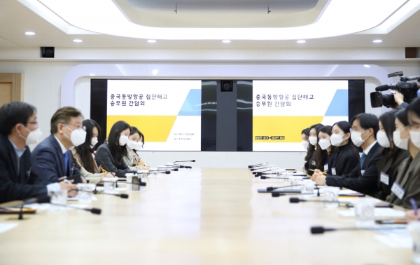 이재명 경기도지사가 최근 중국동방항공측이 한국인 승무원을 부당하게 집단 해고한 것에 대해 “대한민국의 자존심이 걸린 문제”라고 규정하며 경기도가 나서 지방정부 차원에서 가능한 모든 방법을 찾겠다고 말했다.이재명 지사는 20일 오전 경기도청 상황실에서 중국동방항공 집단해고 승무원 및 법률대리인 20여명과 간담회를 갖고, 이 같은 뜻을 밝혔다.이 지사는 이날 한국인 승무원에 대한 사측의 차별과 부당 노동행위에 대한 진상을 파악하고, ‘사실상 해고’인 갑작스러운 기간만료 통보로 큰 상실감을 겪고 있는 해직 승무원들에게 위로의 말을 전했다.