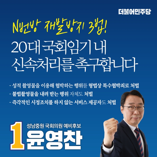 더불어민주당 성남 중원 윤영찬 후보는 최근 대한민국 사회에 충격을 주고 있는 ‘n번방 사건’에 대해 재발방지 3법을 제안하며, 20대 국회의 임기가 끝나기 전에 우선 처리해 줄 것을 촉구했다.