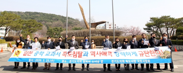 경기도의회 독도사랑·국토사랑회(회장 민경선 의원)가 25일 경기도의회 평화의 소녀상 앞에서 일본 중학 교과서 독도침탈과 역사왜곡 규탄 성명을 발표하였다.독도사랑·국토사랑회는 지난 24일 일본 문부과학성이 발표한 중학 교과서 검정 결과에 대하여 규탄하였다. 일본 교과서 검정본에는 ‘독도가 일본 고유의 영토이며 한국이 불법 점거하고 있다’는 등 독도를 침탈하고 역사를 왜곡하는 주장이 담겨있다.