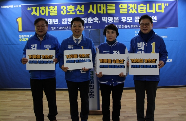 김병관 국회의원(성남분당갑)과 김태년 국회의원(성남수정), 박광온 국회의원(수원정), 정춘숙 국회의원(비례대표, 용인병(수지) 후보) 등 경기 남부권역 4명의 여당 국회의원은 오늘(28일) 지하철 3호선 시대(수서~판교~용인~수원)를 열기 위해 공동의 노력을 취하겠다고 발표했다. 이에 따라 지하철 3호선이 경기 남부권역을 지나가는 계획이 탄력을 받을 전망이다.