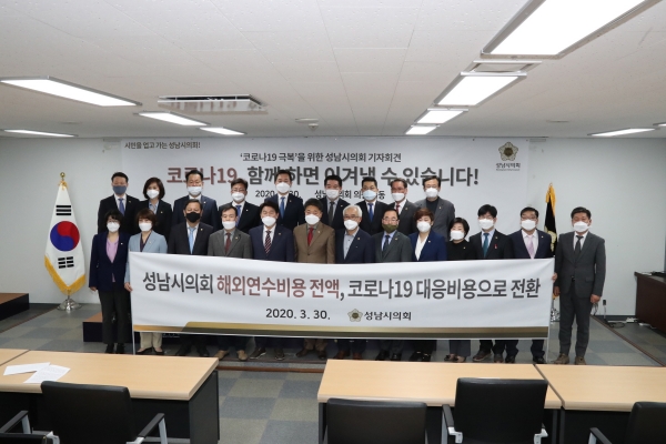 성남시의회(의장 박문석)는 30일 시의회 4층 세미나실에서 기자회견을 열어 올해 시의원 해외연수를 취소하고 그에 따른 예산 2억 9백만원을 코로나19 확산으로 어려움을 겪는 시민들의 생명과 재산보호에 쓰겠다고 뜻을 밝혔다.