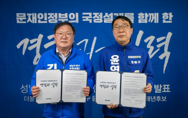 더불어민주당 성남·중원 윤영찬 후보, 성남·수정 김태년 후보, 6대 공약 공동선언문 발표 더불어민주당 성남·중원에 출마하는 윤영찬 후보와 성남·수정에 출마하는 김태년 후보가 문재인정부의 국정설계를 함께 한 ‘경험과 실력’을 바탕으로 성남 원도심 발전을 위한 6대 공약에 대한 공동선언문을 발표했다.