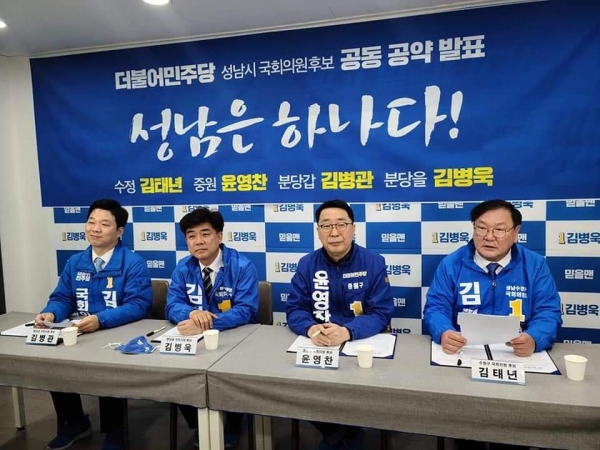 성남시 수정구 김태년 후보, 중원구 윤영찬 후보, 분당갑 김병관 후보, 분당을 김병욱 후보는 1일 오후 9시 분당을 선거사무소에서 ‘더불어민주당 성남 4개지역 국회의원 후보 공동 공약’을 발표하고, 4개 지역 후보가 힘을 모아 성남 발전의 큰 길을 함께 만들어 가기로 뜻을 모았다.