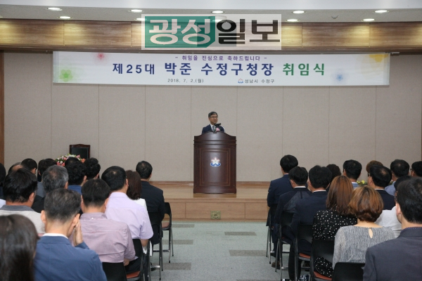 제25대 박 준 수정구청장의 취임식이 7월 2일 수정구청 대회의실에서 열렸다 이날 오후 4시부터 진행된 취임식은 태풍 북상에 따라 행사를 취소하고 수정구 공직자와 인사의 자리를 가졌다.
