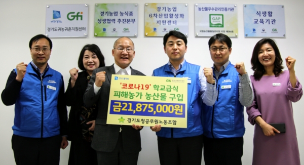 경기도청공무원노동조합(위원장 유관희)은 4월 1일(수) 경기농식품유통진흥원(이하 진흥원)에 방문하여 ‘코로나19’로 인한 학교급식 지연으로 어려움을 겪고 있는 농가를 돕기 위한 잡곡 21,875,000원어치를 구입했다.