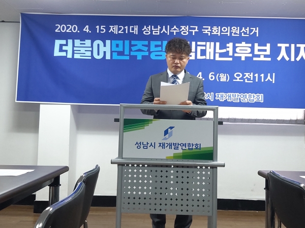 성남시 재개발연합회의는 성남시 태평2동 소재 재개발연합회 사무실에서 더불어민주당 김태년후보 지지 선언 기자회견를 가졌다, 이날 김태년 더불어민주당 후보 선정 기준은 현역 의원의 경우에는 2010성남시정비기본계획 이후 재개발 관련 공약 이행율을 판단하였고, 정치 신인의 경우에는 재개발 공약 및 성남 원시가지 재개발에 대한 정책 수립 및 이해도를 중심으로 판단하였습니다.