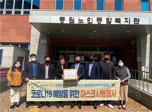 국제로타리 3600지구 성남중앙로타리클럽(회장 산성 남갑식)은“코로나19로 어려움을 겪고 있는 어르신들에게 마스크가 전달되어 조금이나마 도움이 되길 바란다.”고 말했다.