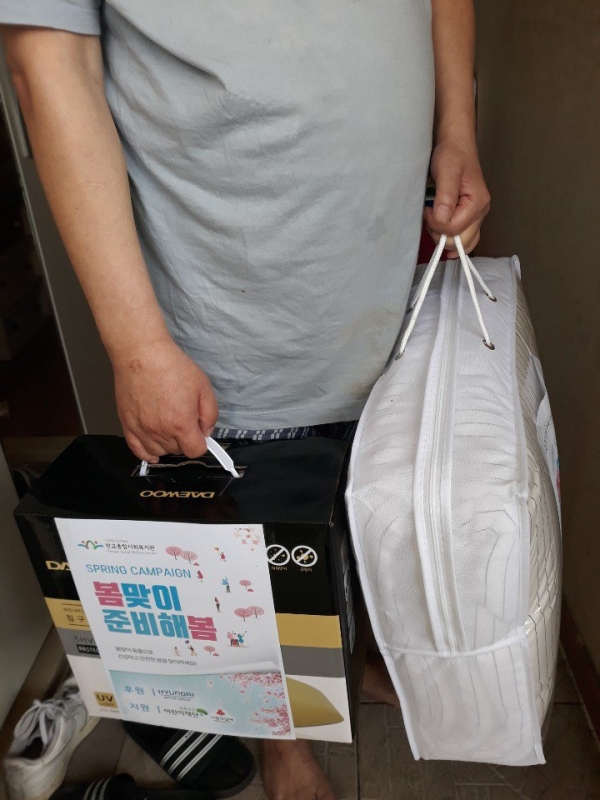 판교종합사회복지관은 2020년 4월 7일(화) 주거‧정서 취약계층 10가구에게‘건강한 봄나기’ 지원을 위해 봄이불과 진드기 살균기 등 향균물품을 전달하였다.