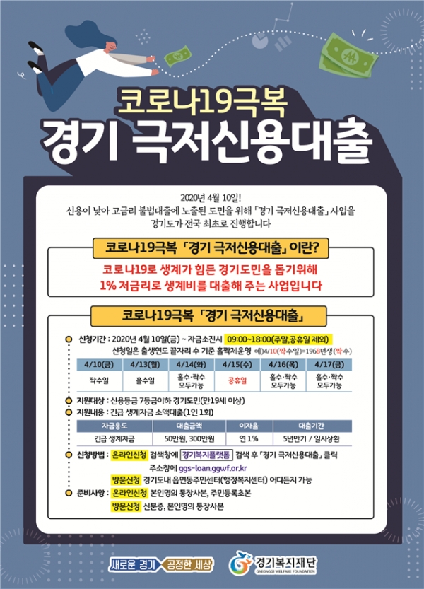 경기 극저신용대출’ 신청을 온라인과 읍·면·동 행정복지센터를 통해 접수한다고 8일 밝혔다.