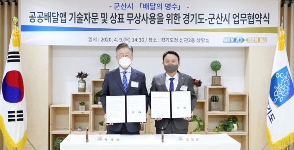 이재명 도지사와 강임준 군산시장은 9일 오후 경기도청 상황실에서 이 같은 내용을 골자로 한 ‘공공배달앱 배달의 명수 기술자문 및 상표 무상사용 업무협약’을 체결했다.