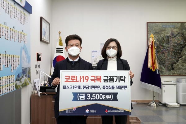 성남시 중원구에 있는 ㈜ISC가 ‘코로나19’ 극복에 힘을 보태고 싶다며 4월 10일 성남시에 마스크 1만개(2000만원), 즉석식품 200인분(500만원), 현금 1000만원을 기탁했다.모두 3500만원 상당이다.