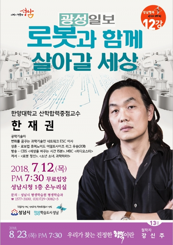 성남시는 ‘로봇공학자’ 한재권 교수를 초빙해 오는 7월 12일 오후 7시 30분 시청 온누리에서 성남행복아카데미 열두번째 번째 강연을 연다.