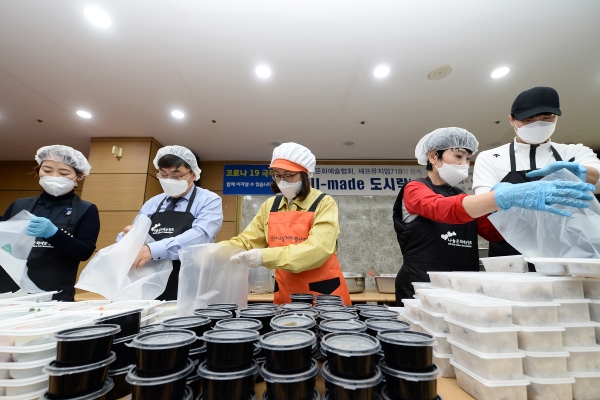 은수미 성남시장은 22일 분당구청 구내식당에서 스타셰프 7인과 함께 취약계층 어르신을 위한 ‘스타셰프 well-made 도시락’ 나눔 행사에 참여했다.영양있는 한 끼 식사 해결이 녹록지 않은 취약계층 어르신 100명에게 도시락을 나눠드리고자 성남시와 (사)나눔문화예술협회(이사장 유현숙)가 손잡고 마련한 이 날 행사에는 셰프뮤지엄718의 스타셰프 7인과 협회회원 등 15여명이 참여한 가운데 진행됐다.