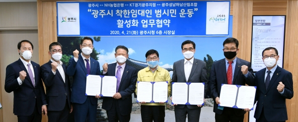 광주시는 지난 21일 시장 접견실에서 코로나19로 인해 어려움을 겪는 소상공인을 돕기 위한 ‘착한임대인 범시민 운동 활성화를 위한 업무협약’을 체결했다.