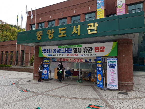 한편, 성남시 중앙도서관은 ‘사전예약 드라이빙도서관’을 최초로 시행하여 사전 예약 후 드라이브스루 혹은 워킹스루를 통하여 대출하는 시스템을 추진하여 코로나19에도 안전하게 책을 읽을 수 있는 환경을 조성하고자 노력하고 있다.