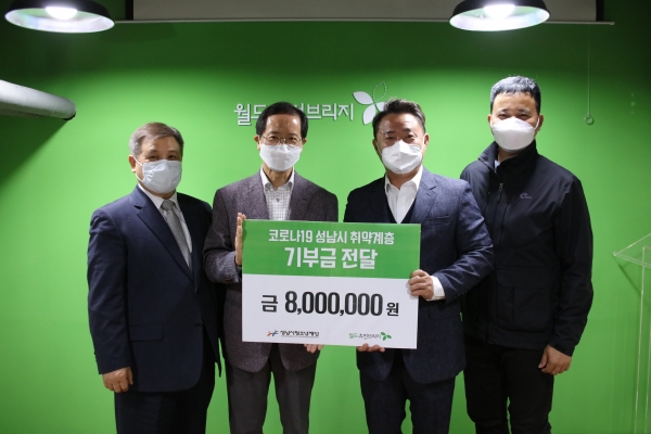 성남시청소년재단(대표이사 진미석)은 신종 코로나바이러스(코로나-19)로 힘든 시기를 겪고 있는 성남시 취약계층을 돕기 위해 노사 공동으로 직원의 자율적 참여로 모금한 8백만원을 (사)월드휴먼브리지에 기부했다.