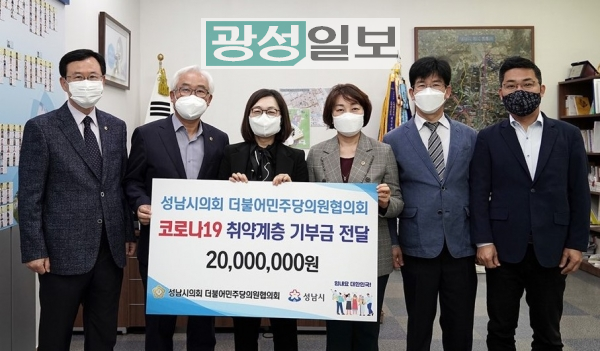 성남시의회 더불어민주당의원협의회(대표의원 박호근)는‘코로나19’ 극복 및 어려움을 겪고 있는 성남시민과 소외계층을 위해 써 달라며 성금 2,000만원을 성남시에 소재한 (사)월드휴먼브리지에 현금 지정기탁하였다.